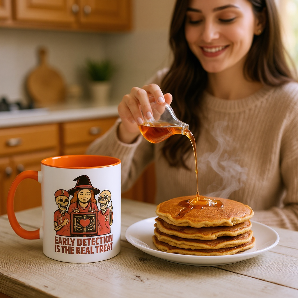 Sip your morning coffee while spreading awareness with this Breast Cancer Awareness Accent Mug. Featuring two designs on one mug – “Early Detection Is the Real Treat” on one side and “Don’t Ghost Your Check-Up” on the other – this mug is both spooky-cute and empowering.