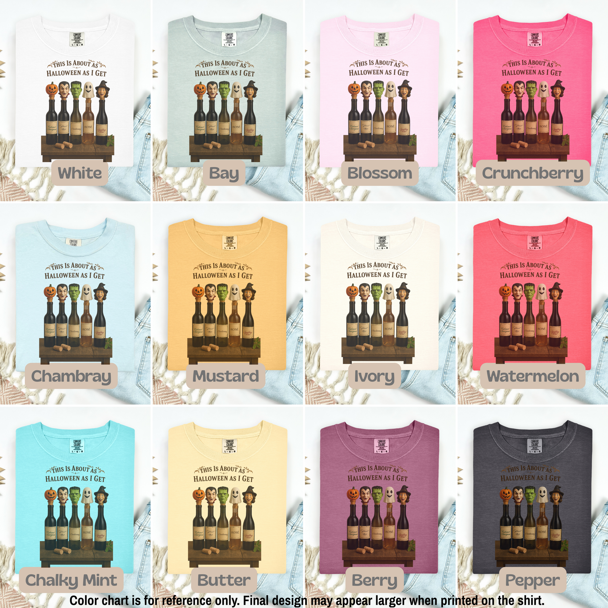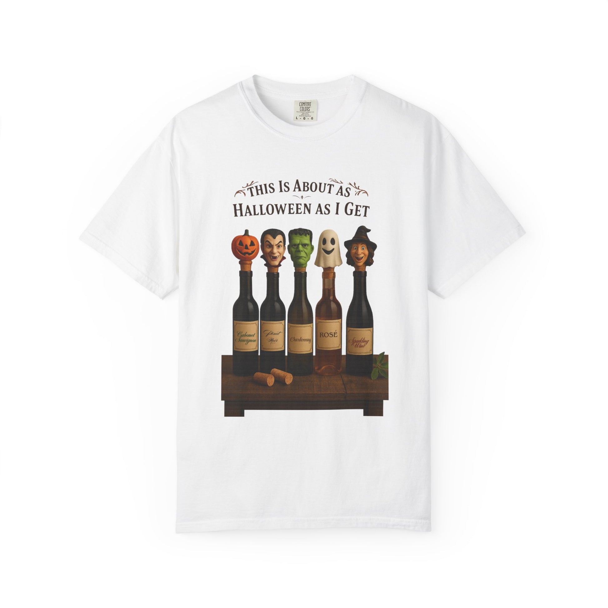 This tee is for the ghouls who prefer grapes over ghosts. Featuring five wine bottles dressed as Halloween icons (yes, even Frankenstein’s into Chardonnay), it’s the perfect blend of spooky and sassy. Whether you're haunting the wine aisle or hosting a low-effort costume party, this shirt says: “I showed up. I poured up. I’m festive enough.”